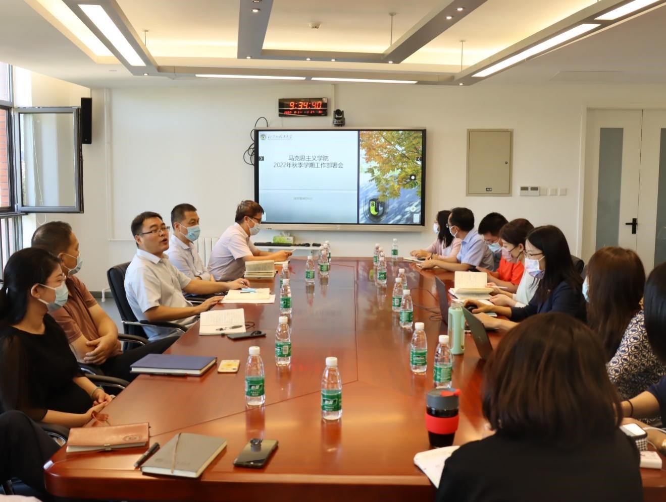 副院长陈永胜对新学期思政课教学工作做出安排,强调在当前疫情形势下,要做好教学安排和应急预案,采用线上线下相结合的教学模式,确保线下和线上教学质量;将习近平总书记在省部级主要领导干部“学习习近平总书记重要讲话精神,迎接党的二十大”专题研讨班开班式上的重要讲话精神和即将召开的二十大精神有机融入集体备课和思政课教学;高标准办好习近平新时代中国特色社会主义思想概论课程。孙磊汇报了马理论研究生专业课调整和精品课程设计、信息宣传、学院新闻网站建设以及科研项目申报总体情况,鼓励老师们在科研项目、专著、论文研究写作方面要紧密结合习近平总书记系列重要讲话精神,早做准备,提前布局,积极产出高质量的成果。