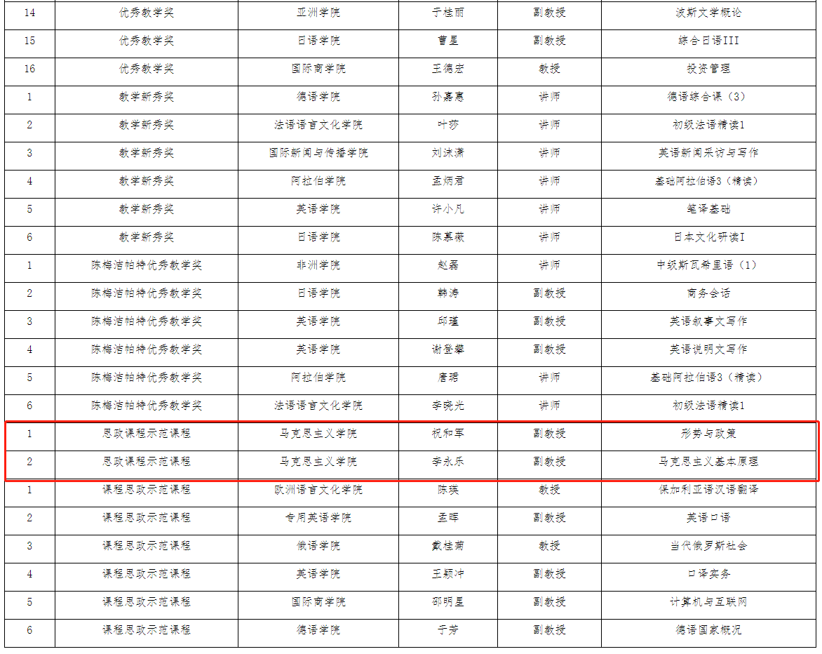根据《pp电子游戏官网本科教育教学奖励办法》,本学期教务处组织了2021年优秀教学奖、教学新秀奖、陈梅洁帕特奖、课程思政/思政课程示范课程奖评审工作,pp电子游戏官网祝和军副教授、李永乐副教授主讲《形势与政策》《马克思主义基本原理》获评思政课程示范课程。