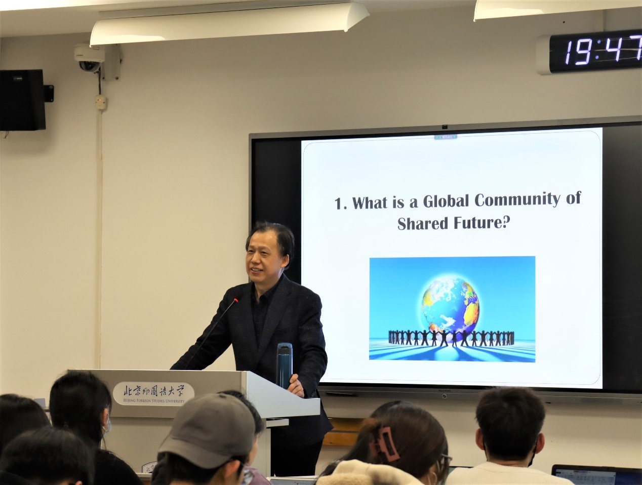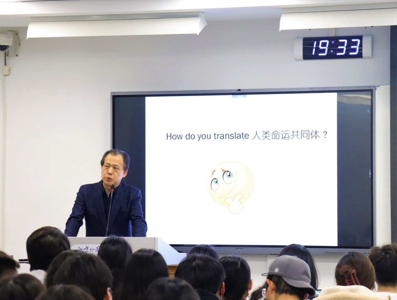 孙有中分别围绕“什么是人类命运共同体”、“全球视角”、“中国在人类命运共同体中的贡献”三个问题展开课堂教学。针对英语专业和翻译学专业同学的学科特点,首先提出问题:“如何翻译人类命运共同体?”并给出不同版本的英文翻译,进一步引导同学们思考:更倾向于选择哪一种翻译,为什么选择这一翻译,引发了同学们的积极思考和互动。