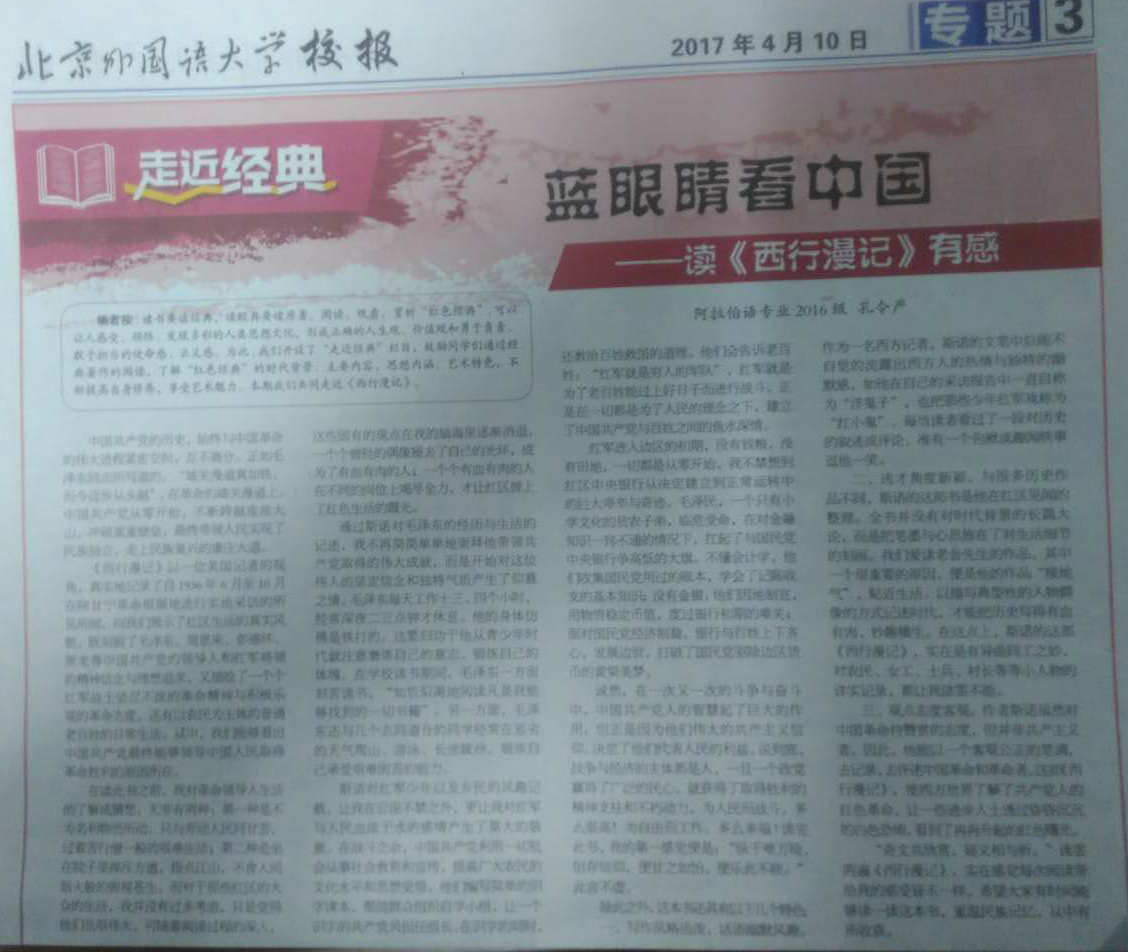 在“中国近现代史纲要”课程中,指导老师在课程教授过程中,积极引导学生阅读《西行漫记》、《鸦片战争》、《老一代革命家家书选》、《天朝的崩溃》等人文社科书籍,帮助他们了解“红色经典”的时代背景、主要内容、思想内涵、艺术特色,促进学生不断提高自身修养,享受艺术魅力。并将他们的学习心得通过北外校报发表,提高了学生读书、思考的积极性,培养了他们形成正确的人生观、价值观和勇于负责、敢于担当的使命感、正义感。