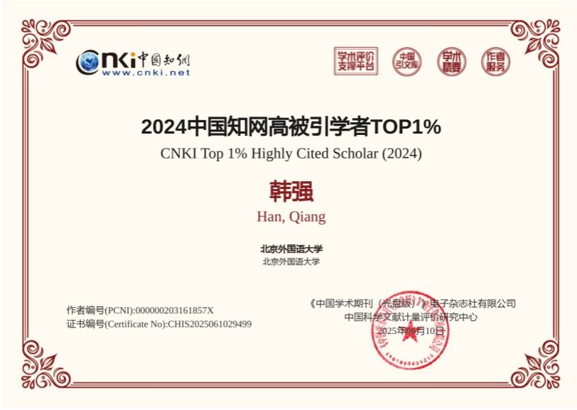pp电子游戏官网韩强教授入选2024年度知网高被引学者TOP1%