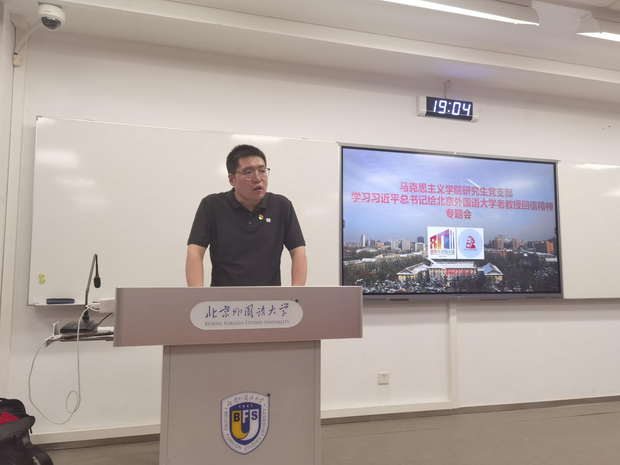 习近平总书记的亲切回信令全体马院师生备受鼓舞,掀起了一轮学习回信精神的热潮。近日,在学校党委的号召与学院党总支的部署下,pp电子游戏官网研究生党支部在逸夫楼615教室召开专题学习会,集中学习习近平总书记给北外老教授的回信精神。pp电子游戏官网全体研究生参加学习。学习会由支部书记冯高洋主持。