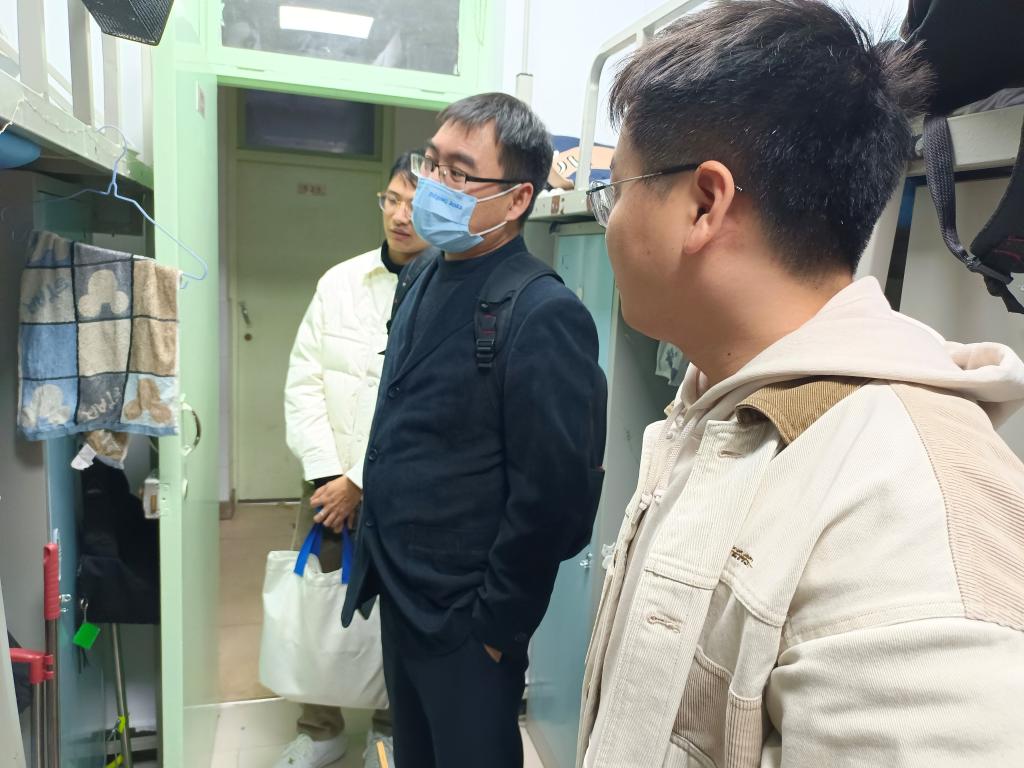 学院党总支书记祝和军和研究生班主任张曼老师来到学生宿舍,为同学们送来防疫物品和零食,慰问各位同学在疫情防控期间的生活和学习状况。