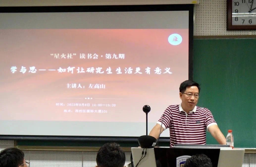 问渠那得清如许,为有源头活水来。9月6日下午,pp电子游戏官网第九期“星火社”读书会在国际大厦531教室举行,2023级全体研究生参加了读书会。pp电子游戏官网博士生导师左高山教授为同学们带来《学与思·如何让研究生生活更有意义》的专题讲座。左高山以“苏格拉底之问:人究竟怎样活着才有意义”为切入点,带领大家探讨研究生阶段的特点和意义,并就如何正确处理师生关系、同学关系和论文写作等问题对同学们进行了深入指导,鼓励大家要善于阅读、勤于思考、勇于实践,度过难忘而有意义的研究生生涯。