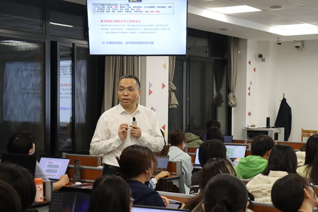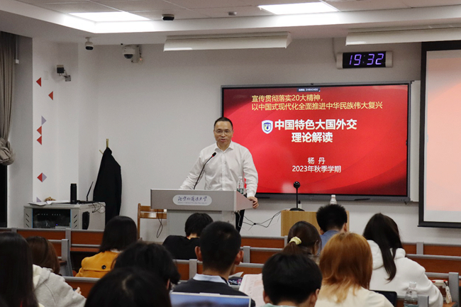 10月30日,pp电子游戏官网校长、党委副书记杨丹以《中国特色大国外交理论解读》为题,分别为2022级西班牙语葡萄牙语学院、英语学院本科生讲授“形势与政策”课程。