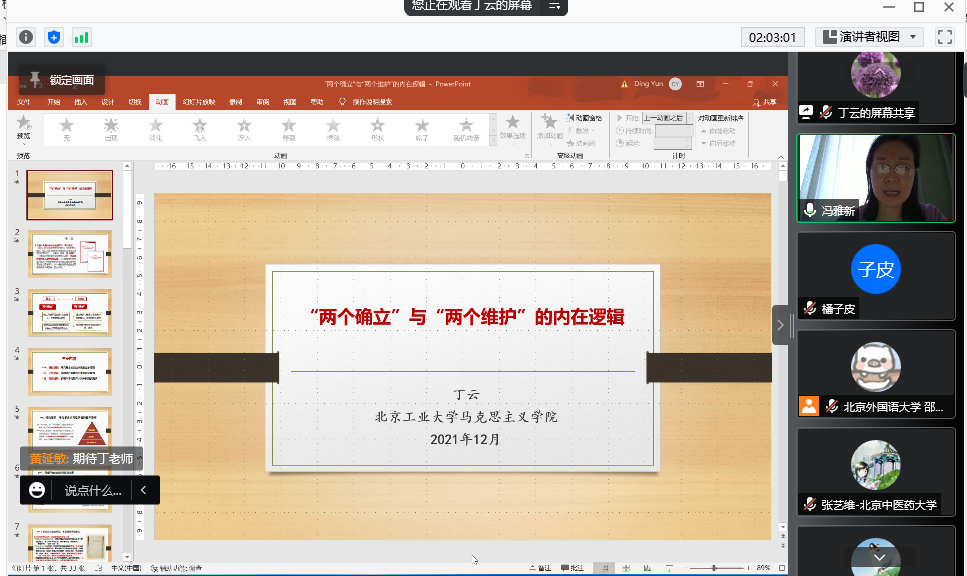 北京工业大学pp电子游戏官网副院长丁云教授以“‘两个确立’与‘两个维护’的内在逻辑”为题做了主题报告。她从马克思主义政党建设中的权威理论出发,阐释权威存在的必然性及其表现形式,并结合中国共产党百年历史和党的领导核心形成的经验与中华民族伟大复兴的必然要求,从理论、历史与现实三个方面论述了“两个确立”与“两个维护”的内在逻辑。她强调,理解与把握“两个确立”与“两个维护”的内在逻辑,是深入理解“两个确立”,坚决做到“两个维护”的前提与基础。