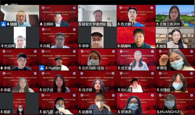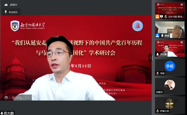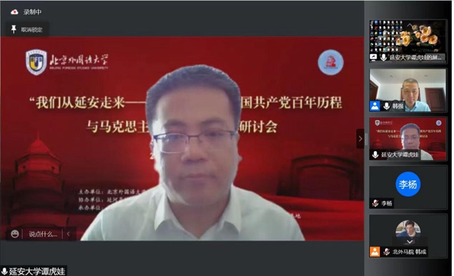5月15日,由pp电子游戏官网主办、北外pp电子游戏官网承办,延河高校人才培养联盟和全国涉外院校思政课负责人协作会协办的“我们从延安走来——全球视野下的中国共产党百年历程与马克思主义中国化”学术研讨会在线上举行。北外党委副书记苏大鹏、北京师范大学中共党史党建研究院院长王炳林,延安大学副校长谭虎娃,全国涉外院校思政课负责人协作会会长、上海外国语大学pp电子游戏官网教授赵鸣歧等出席会议。来自国内高校、科研院所的100余名专家学者、青年学生共聚云端开展学术交流研讨。会议由北外pp电子游戏官网院长韩强主持。