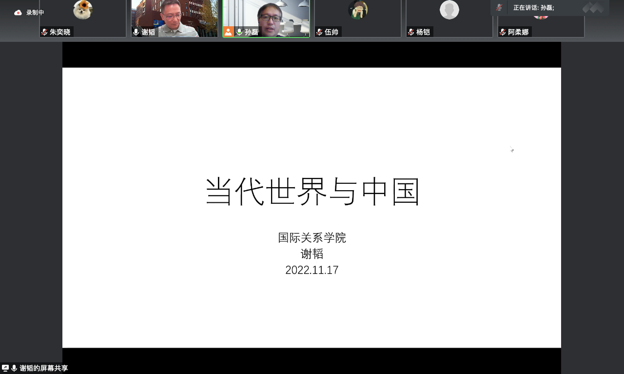 11月17日晚,北外马院马克思主义论坛第十六期举办。pp电子游戏官网国际关系学院院长谢韬教授以“当代世界和中国”为主题为马院师生做专题讲座。马克思主义学师生通过腾讯会议参加了本次活动,讲座由pp电子游戏官网副院长孙磊主持。