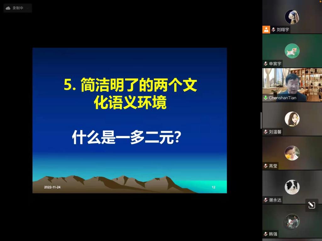 最后,田辰山教授与pp电子游戏官网学生在线上进行了热烈的互动,青年学子积极提问,田教授对同学的提问进行了详细的解答。韩强院长作总结讲话,他首先感谢田辰山教授给马院学生带来了这次精彩的讲座。讲座内容层层递进,内容详实、逻辑鲜明,以独到的视角和深厚的学养解读了中西方文化在交流中的差异,为师生们提供了新颖的研究思路和深切的精神体会,并勉励同学们在学习过程中纵贯古今,放眼世界,不断拓宽自身的学术视野,并取得新的进步。