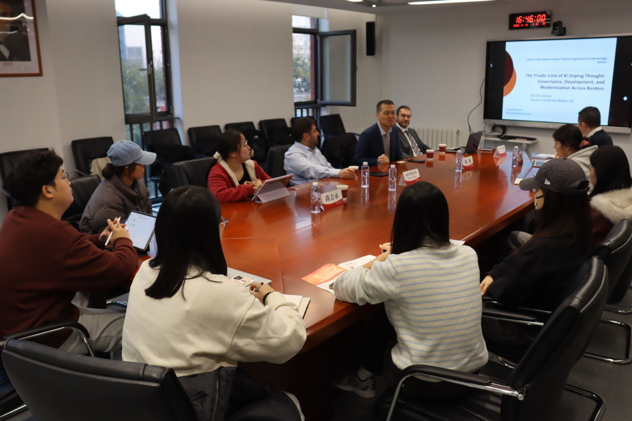 在讨论交流环节,韩强教授同居尔詹博士、阿克乔奇先生深入交流了习近平新时代中国特色社会主义思想的系统性学理阐释和海外传播路径,在场的研究生就西方学界研究习近平新时代中国特色社会主义思想的基本态势、欧洲民众对中国崛起的认识等问题进行了广泛讨论。