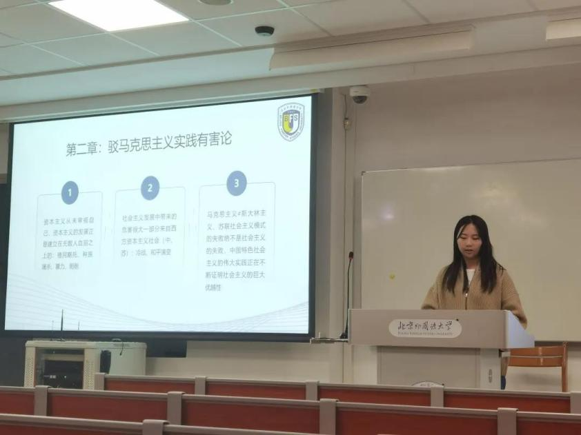 第一位分享的是2021级崔凡页同学,她分别从“马克思主义的实现是马克思主义的消失”、“只要资本主义存在,马克思主义就不会终结”以及“马克思所预测的资本主义将会遇到的问题正在现今上演”三方面反驳“马克思主义终结论”。对于“马克思主义实践有害论”的观点,她分别从“资本主义的发展正是建立在血腥上”、“社会主义发展中的危害很大程度来自于西方社会”、“苏联社会主义模式的失败绝不是社会主义的失败”三个方面为马克思主义辩护。为了进一步厘清书中涉及的理论问题,她摘录了马克思的博士论文对“哲学的消亡就是哲学的实现”作了深入地阐释,指出其对于我国建设中国特色社会主义社会的积极启示。
