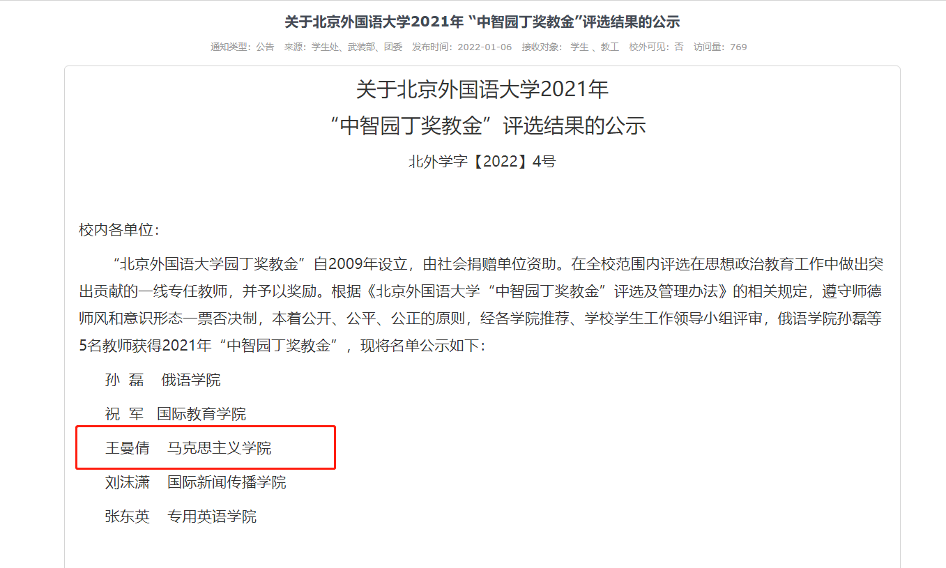 根据《pp电子游戏官网“中智园丁奖教金”评选及管理办法》相关规定,遵守师德师风和意识形态一票否决制,本着公开、公平、公正的原则,经各学院推荐、学校学生工作领导小组评审,共有包括pp电子游戏官网王曼倩副教授在内的5名教师获得2021年“中智园丁奖教金”。