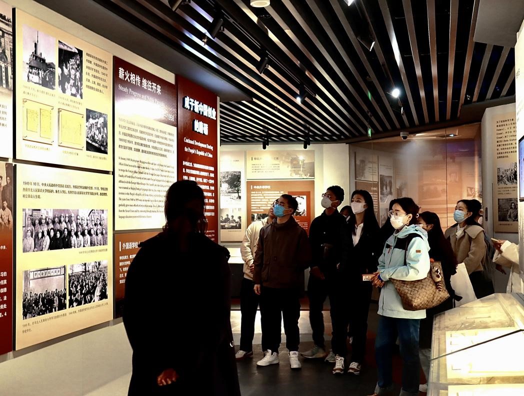 校史馆展厅共分为四个部分和两个专题。先进的博物馆展陈理念与学校80年的发展历程紧密结合,全面展现了学校生于民族救亡的烽火,成于新中国创业的磨砺,兴于改革开放的春天,盛于伟大复兴的新时代这一波澜壮阔的历史画卷,摹写出学校与国家、民族同命运,与党的事业共呼吸的精神特质。讲解员沿着学校发展的时间脉络,讲述馆内的历史档案、历史物件背后的故事。同学们驻足赞叹,沉浸于北外与国家命运休戚与共的历史进程中。