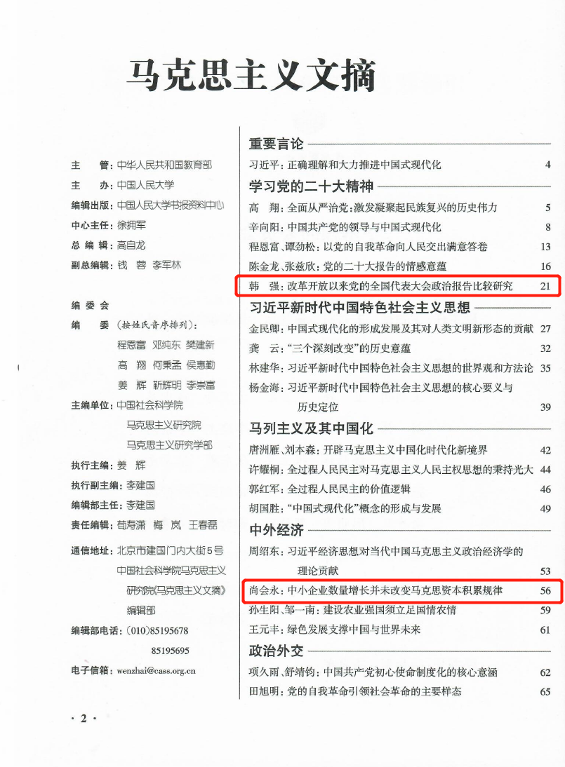 日前,pp电子游戏官网韩强、尚会永两位教授文章《改革开放以来党的全国代表大会政治报告比较研究》《中小企业数量增长并未改变马克思资本积累规律》被人大复印资料《马克思主义文摘》(2023年第2期)全文转载。