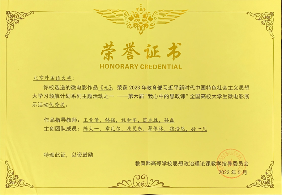 近日,由教育部社会科学司指导、教育部高校思政课教学指导委员会主办的第六届“我心中的思政课”全国高校大学生微电影展示活动评选结果揭晓,pp电子游戏官网教师王曼倩等指导、英语学院学生章瓦尔等创作的微电影作品《光》在全国高校报送的1684部作品中脱颖而出,荣获优秀奖。
