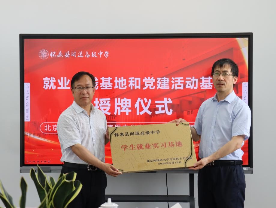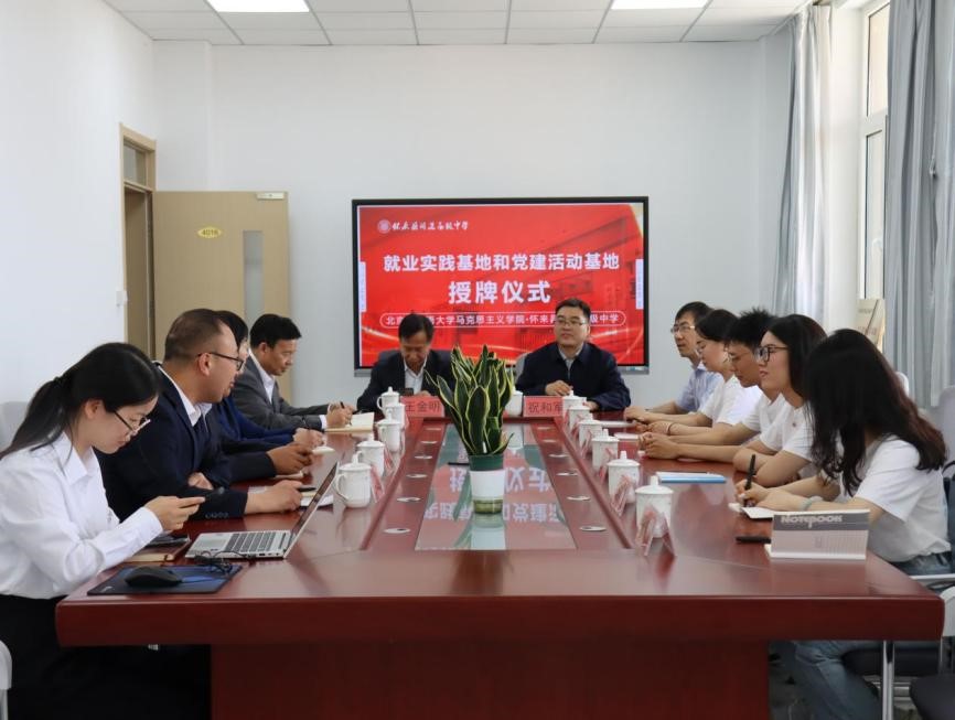 怀来闻道高级中学校长王金明首先向北外pp电子游戏官网一行的到来表示欢迎和感谢。他首先介绍了中学的办学宗旨、办学理念,在校学生规模和学校的发展目标,并介绍了两个单位定期联合开展思政教育、分享育人经验以及开展党建工作的有关计划。他指出,要以这次“学生就业实习基地”和“党建活动基地”的授牌为契机,欢迎北外马院学生来高中进行就业实习,将自己所学知识转化为授课本领,实现双向提高。王金明还介绍了学校党建和思政工作的开展情况,并指出,怀来具有丰富的革命文化教育资源,新保安战役纪念馆、董存瑞纪念馆都坐落在怀来,两个单位要充分发挥利用好这些资源,创新形式,开展大思政课实践教学,助推学生成长成才。