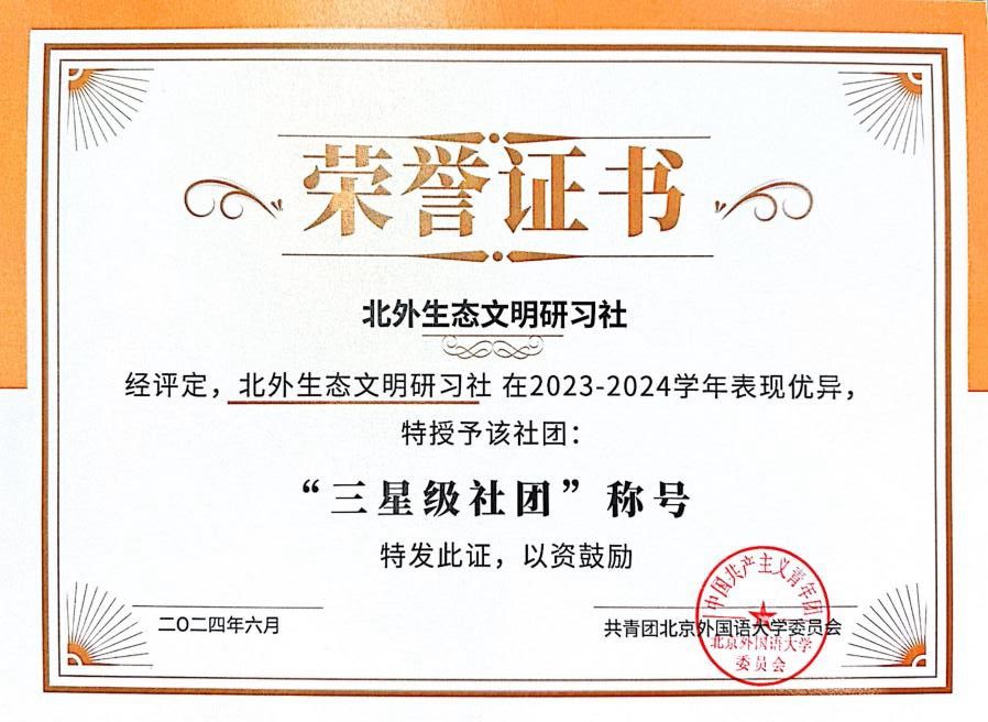 6月12日,pp电子游戏官网举行2023-2024学年社团星级大会。社团工作部对过去一年的社团工作进行了总结,并公布了星级社团评审结果。经评选,北外生态文明研习社荣获pp电子游戏官网2023-2024学年“三星级社团”称号。