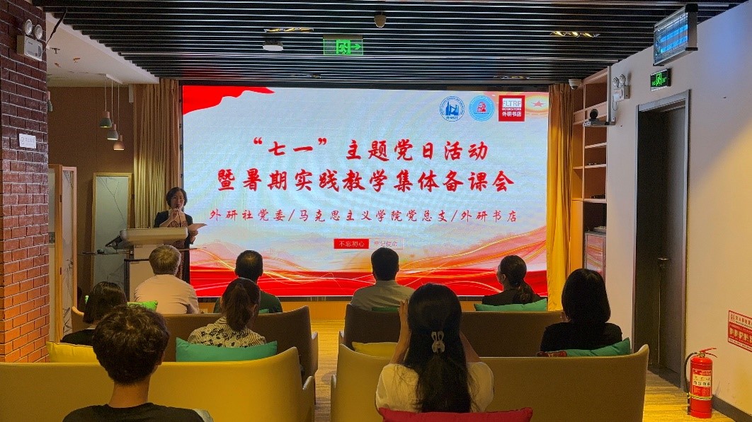 该活动主要围绕庆祝中国共产党成立103周年、学习贯彻习近平经济思想、学习贯彻习近平总书记给北外老教授的回信精神、学习贯彻习近平总书记对学校思政课建设的重要指示精神、暑期实践教学活动集体备课等主题展开。刘珊珊以“中国共产党的百年奋斗历程与马克思主义中国化的理论创新”为题,从历史的角度和脉络,重温了中国共产党的百年奋斗历程,从理论上阐释习近平新时代中国特色社会主义思想是当代中国的马克思主义、21世纪的马克思主义。孙磊以“新质生产力和生态文明建设”为题,回顾了新时代十年习近平总书记在东北地区考察调研的足迹,阐释了东北振兴在国家战略上的重要意义。他从新质生产力和生态文明建设之间的关系入手,详细介绍了习近平总书记提出新质生产力理论的时代背景,深入讲解了新质生产力理论在习近平生态文明思想中的重要地位和作用。鞠慧以“对外讲好中国故事,推动海外出版事业”为题,分享了外研社在学习贯彻习近平总书记给北外老教授的回信精神方面的具体实践。她结合外研社在海外出版传播方面的各项工作,与大家交流了《习近平谈治国理政》、《习近平总书记教育重要论述讲义》等重要著作的多语种翻译出版工作,阐述了对外讲好中国故事的重要性,激发了大家对于文化传播与交流的深刻思考。暑期社会实践团队张池同学结合思政课对她的理论熏陶,交流了学习习近平总书记对学校思政课建设重要指示精神的感想,围绕北外“有家国情怀、有全球视野、有专业本领”的人才培养目标,表达了北外学子新时代新征程上的责任与担当。